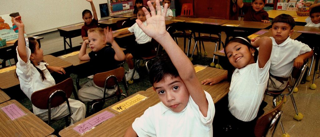 Monolingual Hispanic students raise their hands to answer a question during a class taught in Spanish at Birdwell Elementary School September 11, 2003 in Tyler, Texas. (Courtesy: Getty Images)