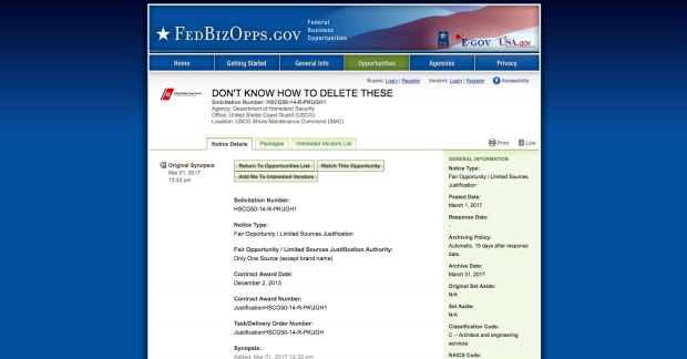 A few hours after Wingert’s post, the same contracting office posted a notice on another Coast Guard project aimed at alerting small businesses to upcoming construction projects. The post title reads: “Small Business Events: Information on Doing Business with U.S. Coast Guard Shore Infrastructure Logistics Center Construction – Acquisition Planning Forecast System (APFS) FY17 2nd Quarter.”